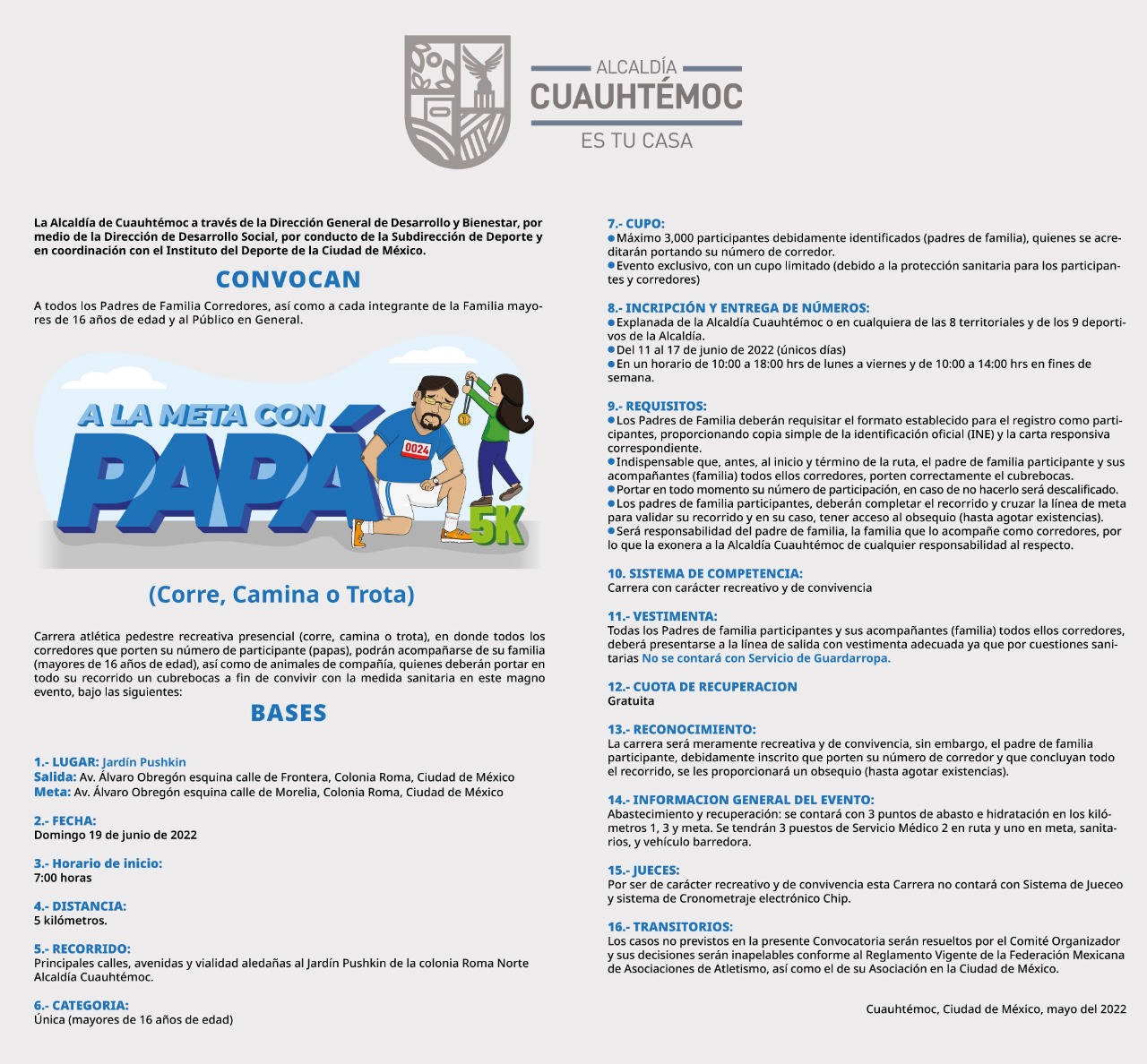 Esta convivencia atlética recreativa denominada Carrera “A la Meta con Papá” 5K se llevará a cabo a partir de las 7:00 hrs del domingo 19 de junio de 2022, con Salida en Avenida Álvaro Obregón esquina Calle de Frontera y Meta en: Av. Álvaro Obregón esquina Calle Morelia (Jardín Pushkin) en la colonia Roma Norte.