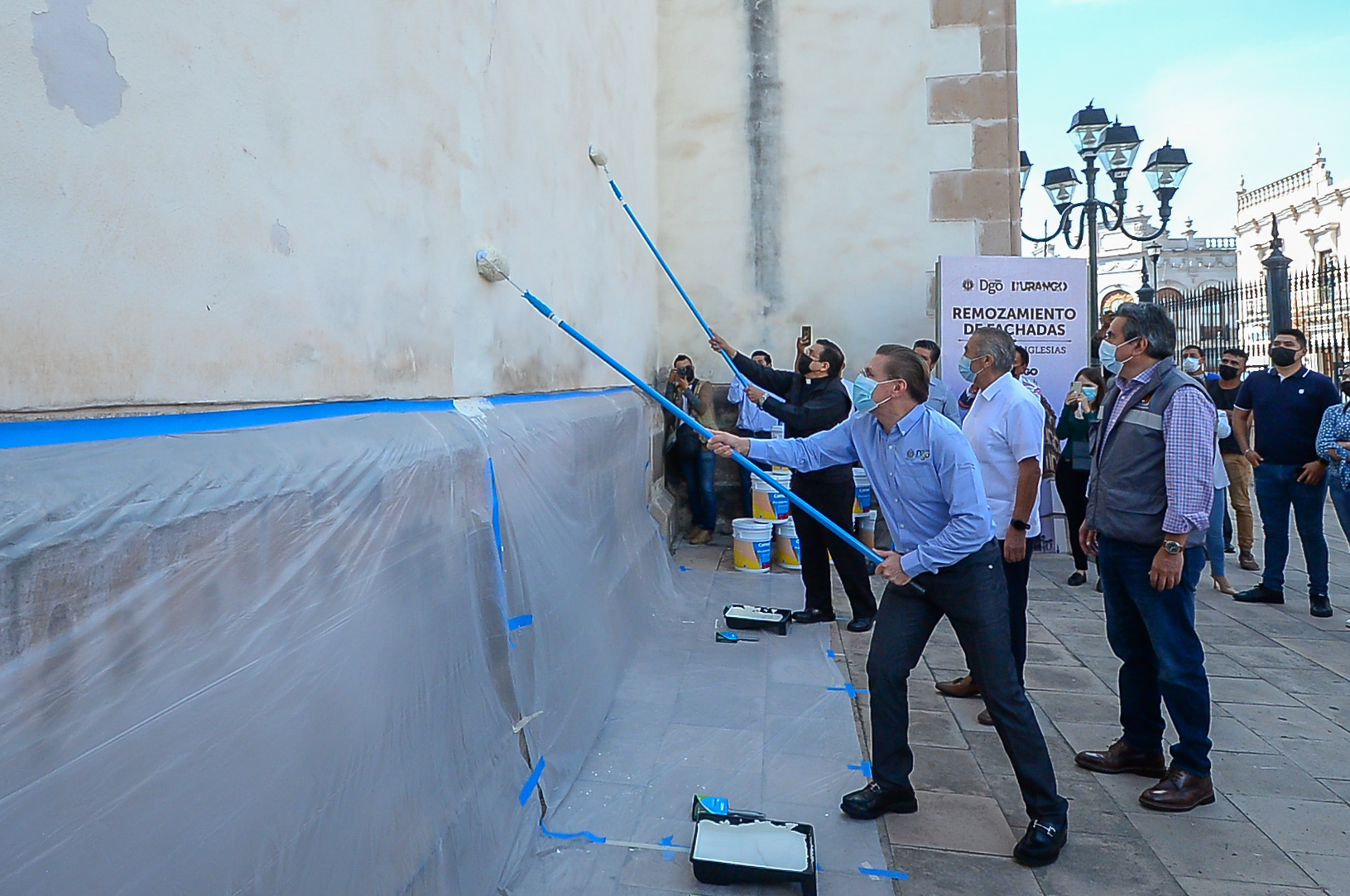 DURANGO, DURANGO; MX.- En Durango continuamos con el programa de remozamiento de fachadas en el centro histórico y resaltaremos la belleza e historia de nuestra Catedral Basílica Menor, expresó el gobernador José Rosas Aispuro Torres al iniciar con la pintura de iglesias de la capital, junto el arzobispo Faustino Armendáriz y el presidente de Asociación Mexicana de Hoteles y Moteles, Francisco Díaz de León.