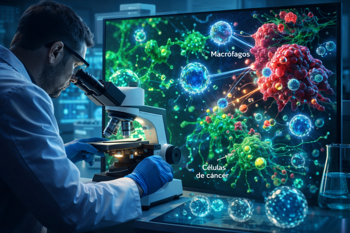 Un investigador observa, mediante microscopía avanzada, la interacción entre macrófagos modificados y células cancerígenas en una estrategia que combina nanotecnología y terapia celular para mejorar la precisión contra el neuroblastoma.Ilustración / DALL-E