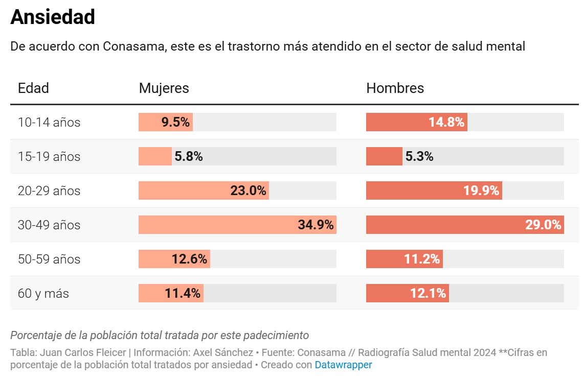En total se atendieron 60 mil 144 casos de ansiedad y 76 mil 289 de depresión, en ambos el grupo más afectado fueron hombres y mujeres de 30 a 49 años de edad.