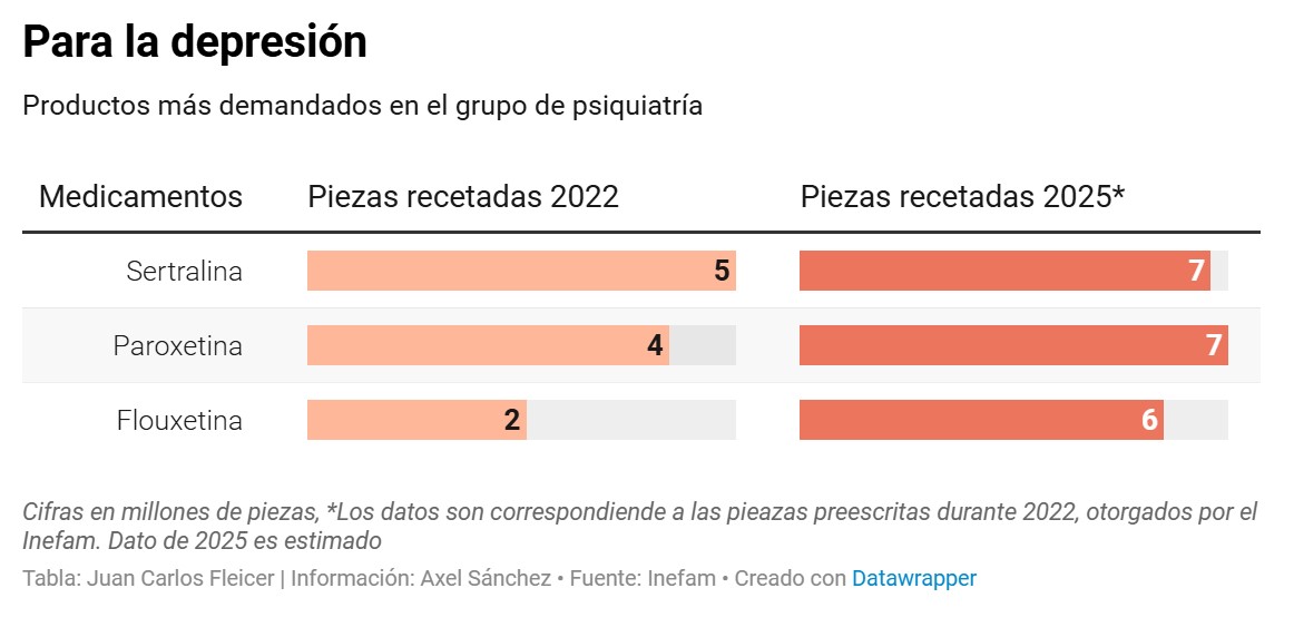 Fluoxetina —medicamento utilizado para tratar depresión y ansiedad—, pasó de.3 millones de piezas prescritas en 2022 a 6.2 millones en 2025.