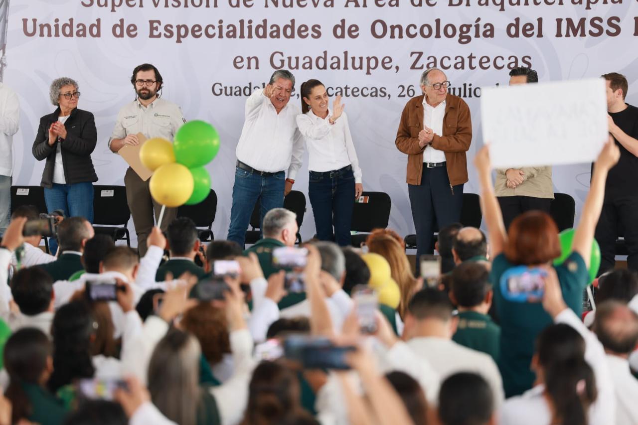 GUADALUPE, ZACATECAS, MX.– Al encabezar la entrega de la nueva Unidad de Braquiterapia en la Unidad de Especialidades Oncológicas del IMSS Bienestar en Guadalupe, la Presidenta Claudia Sheinbaum anunció una inversión sin precedentes para fortalecer el sistema de salud pública en Zacatecas: 621 millones de pesos para equipamiento médico, además de 1,000 millones para la construcción y renovación de hospitales.